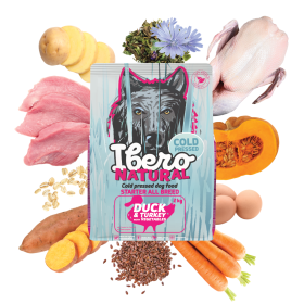 Ibero Cold Pressed Starter Turkey & Duck je komplexná a vysoko výživná receptúra navrhnutá špeciálne pre potreby najmladších šteniat. Základ tvorí 39% sušeného morčacieho a kačacieho mäsa doplneného o 13% vysoko purifikovaného morčacieho proteínu , ktoré spoločne poskytujú optimálne množstvo kvalitných bielkovín potrebných pre zdravý rast, vývoj svalov a správnu funkciu imunitného systému. Batáty, zemiaky, ovsené vločky, tekvica a mrkva slúžia ako prirodzené zdroje energie, vlákniny a antioxidantov. Vajcia v prášku dodávajú vysoko biologicky hodnotné bielkoviny. Ľanové semienko, extrakt z čakanky a sušené bylinky harmonizujú trávenie a podporujú zdravie čriev. Beta-glukány posilňujú prirodzenú obranyschopnosť organizmu v citlivom období raného vývoja. Glukosamín a chondroitín sulfát napomáhajú správnemu vývoju kĺbov a chrupaviek. Vďaka technológii lisovania za studena si krmivo uchováva svoju prirodzenú chuť a vysokú nutričnú hodnotu. Granule sú hutné, veľmi dobre stráviteľné av žalúdku nenaberajú na objeme, čo zaisťuje bezpečné a komfortné trávenie. Ibero Cold Pressed Starter Turkey & Duck je 100% prírodné krmivo bez umelých konzervantov, farbív a GMO a predstavuje ideálnu voľbu pre zdravý štart do života šteniat všetkých plemien.