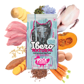 Ibero Cold Pressed Starter Turkey & Duck je komplexná a vysoko výživná receptúra navrhnutá špeciálne pre potreby najmladších šteniat. Základ tvorí 39% sušeného morčacieho a kačacieho mäsa doplneného o 13% vysoko purifikovaného morčacieho proteínu , ktoré spoločne poskytujú optimálne množstvo kvalitných bielkovín potrebných pre zdravý rast, vývoj svalov a správnu funkciu imunitného systému. Batáty, zemiaky, ovsené vločky, tekvica a mrkva slúžia ako prirodzené zdroje energie, vlákniny a antioxidantov. Vajcia v prášku dodávajú vysoko biologicky hodnotné bielkoviny. Ľanové semienko, extrakt z čakanky a sušené bylinky harmonizujú trávenie a podporujú zdravie čriev. Beta-glukány posilňujú prirodzenú obranyschopnosť organizmu v citlivom období raného vývoja. Glukosamín a chondroitín sulfát napomáhajú správnemu vývoju kĺbov a chrupaviek. Vďaka technológii lisovania za studena si krmivo uchováva svoju prirodzenú chuť a vysokú nutričnú hodnotu. Granule sú hutné, veľmi dobre stráviteľné av žalúdku nenaberajú na objeme, čo zaisťuje bezpečné a komfortné trávenie. Ibero Cold Pressed Starter Turkey & Duck je 100% prírodné krmivo bez umelých konzervantov, farbív a GMO a predstavuje ideálnu voľbu pre zdravý štart do života šteniat všetkých plemien.