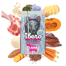 Ibero Cold Pressed Lamb je vyvážená a funkčná receptúra navrhnutá tak, aby plne pokryla nutričné potreby dospelých psov stredných a veľkých plemien. Základ tvorí 30% dehydrovaného jahňacieho mäsa , ktoré poskytuje vysoko kvalitné a dobre stráviteľné bielkoviny nevyhnutné pre udržanie svalovej hmoty, sily a celkovej kondície. Jahňacia a bravčová pečeň obohacujú krmivo o prírodné vitamíny a minerály podporujúce vitalitu, metabolizmus a chutnosť. Batáty, zemiaky, ryžová múka, ovsené vločky, tekvica a mrkva slúžia ako prirodzené zdroje energie, vlákniny a antioxidantov. Ľanové semienko, čakankový extrakt a sušené bylinky harmonizujú trávenie a podporujú zdravie čriev. Beta-glukány posilňujú prirodzenú obranyschopnosť organizmu. Pre dlhodobú podporu pohybového aparátu je receptúra doplnená o glukosamín a chondroitín sulfát, ktoré pomáhajú udržiavať kĺby pružné a odolné. Vďaka technológii lisovania za studena si krmivo uchováva svoju prirodzenú chuť a nutričnú hodnotu. Granule sú hutné, dobre stráviteľné av žalúdku nenaberajú na objeme, čo je ideálne pre každodenné kŕmenie. Ibero Cold Pressed Lamb je 100% prírodné krmivo bez umelých konzervantov, farbív a GMO a predstavuje spoľahlivú voľbu pre dlhodobú, kvalitnú a vyváženú výživu dospelých psov stredných a veľkých plemien.