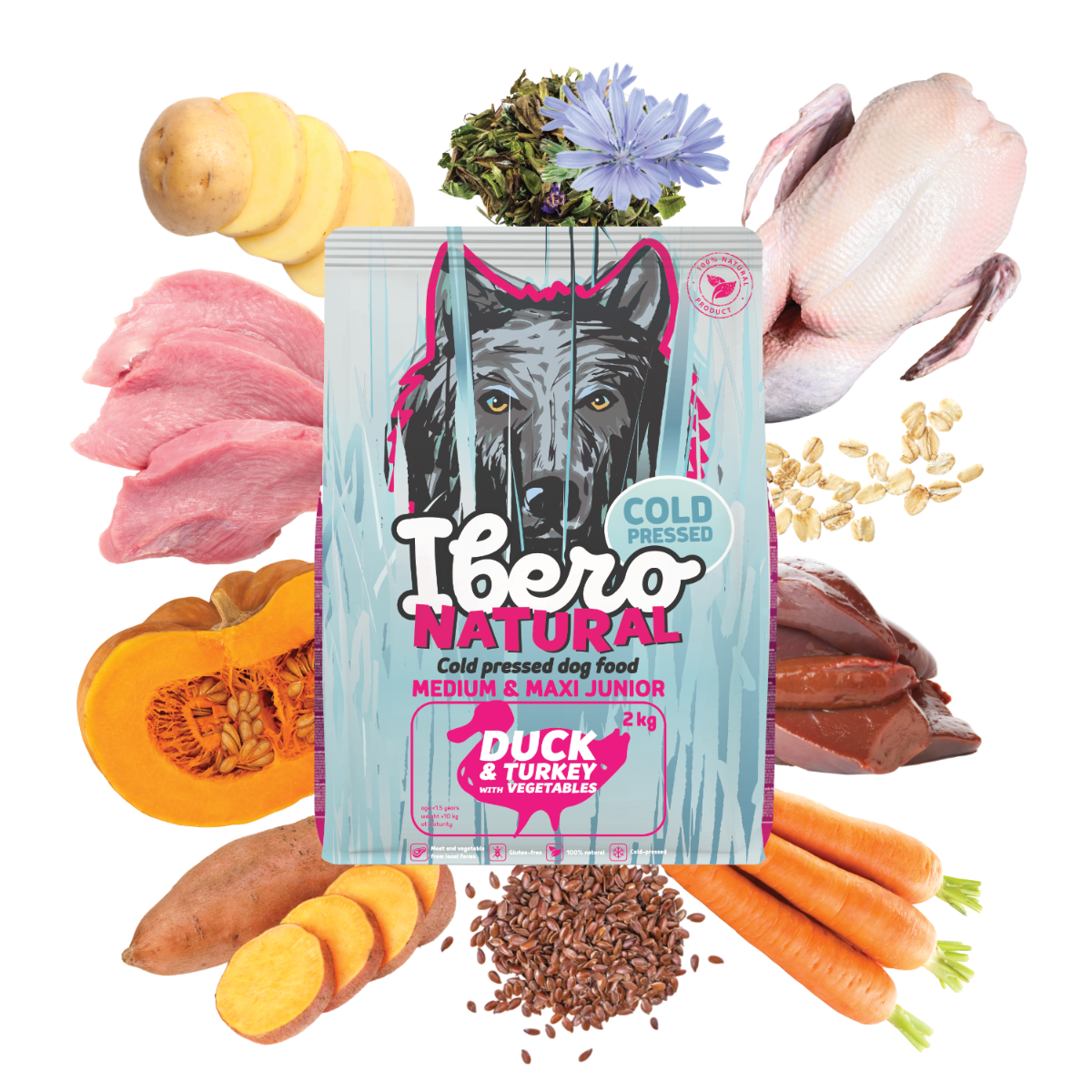 Ibero Cold Pressed Junior Turkey & Duck je vyvážená a funkčná receptúra navrhnutá tak, aby plne pokryla nutričné potreby šteniat stredných a veľkých plemien. Základ tvorí 34% dehydrovaného morčacieho a kačacieho mäsa , ktoré poskytuje vysoko kvalitné a dobre stráviteľné bielkoviny nevyhnutné pre zdravý rast, vývoj svalov a celkovú vitalitu. Jahňacia pečeň prirodzene obohacuje krmivo o vitamíny a minerály podporujúce metabolizmus, imunitný systém a chuťovú atraktivitu. Batáty, zemiaky, ovsené vločky, tekvica a mrkva slúžia ako prirodzené zdroje energie, vlákniny a antioxidantov. Ľanové semienko, čakankový extrakt a sušené bylinky harmonizujú trávenie a podporujú zdravie čriev. Beta-glukány posilňujú prirodzenú obranyschopnosť organizmu v období vývoja. Extrakt z chrupavky, glukosamín a chondroitín sulfát napomáhajú správnemu vývoju kĺbov a chrupaviek, ktoré sú u rastúcich psov vystavené zvýšenej záťaži. Vďaka technológii lisovania za studena si krmivo uchováva svoju prirodzenú chuť a vysokú nutričnú hodnotu. Granule sú hutné, dobre stráviteľné av žalúdku nenaberajú na objeme, čo zaisťuje bezpečné a komfortné trávenie. Ibero Cold Pressed Junior Turkey & Duck je 100% prírodné krmivo bez umelých konzervantov, farbív a GMO a predstavuje ideálnu voľbu pre zdravý štart do života šteniat stredných a veľkých plemien.