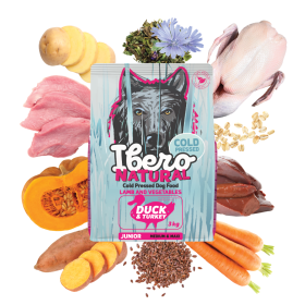 Ibero Cold Pressed Junior Turkey & Duck je vyvážená a funkčná receptúra navrhnutá tak, aby plne pokryla nutričné potreby šteniat stredných a veľkých plemien. Základ tvorí 34% dehydrovaného morčacieho a kačacieho mäsa , ktoré poskytuje vysoko kvalitné a dobre stráviteľné bielkoviny nevyhnutné pre zdravý rast, vývoj svalov a celkovú vitalitu. Jahňacia pečeň prirodzene obohacuje krmivo o vitamíny a minerály podporujúce metabolizmus, imunitný systém a chuťovú atraktivitu. Batáty, zemiaky, ovsené vločky, tekvica a mrkva slúžia ako prirodzené zdroje energie, vlákniny a antioxidantov. Ľanové semienko, čakankový extrakt a sušené bylinky harmonizujú trávenie a podporujú zdravie čriev. Beta-glukány posilňujú prirodzenú obranyschopnosť organizmu v období vývoja. Extrakt z chrupavky, glukosamín a chondroitín sulfát napomáhajú správnemu vývoju kĺbov a chrupaviek, ktoré sú u rastúcich psov vystavené zvýšenej záťaži. Vďaka technológii lisovania za studena si krmivo uchováva svoju prirodzenú chuť a vysokú nutričnú hodnotu. Granule sú hutné, dobre stráviteľné av žalúdku nenaberajú na objeme, čo zaisťuje bezpečné a komfortné trávenie. Ibero Cold Pressed Junior Turkey & Duck je 100% prírodné krmivo bez umelých konzervantov, farbív a GMO a predstavuje ideálnu voľbu pre zdravý štart do života šteniat stredných a veľkých plemien.
