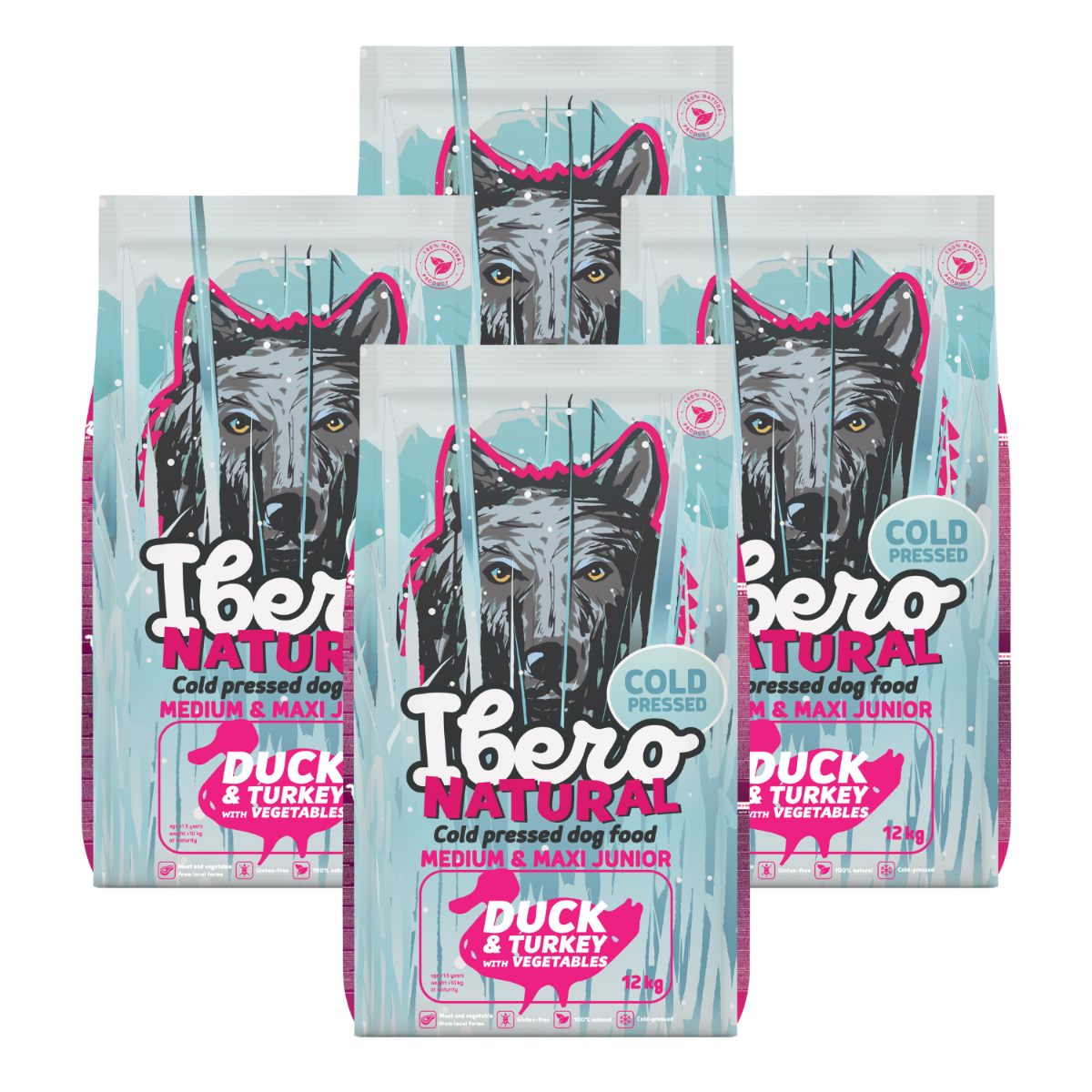 Ibero Cold Pressed Junior Turkey & Duck je vyvážená a funkčná receptúra navrhnutá tak, aby plne pokryla nutričné potreby šteniat stredných a veľkých plemien. Základ tvorí 34% dehydrovaného morčacieho a kačacieho mäsa , ktoré poskytuje vysoko kvalitné a dobre stráviteľné bielkoviny nevyhnutné pre zdravý rast, vývoj svalov a celkovú vitalitu. Jahňacia pečeň prirodzene obohacuje krmivo o vitamíny a minerály podporujúce metabolizmus, imunitný systém a chuťovú atraktivitu. Batáty, zemiaky, ovsené vločky, tekvica a mrkva slúžia ako prirodzené zdroje energie, vlákniny a antioxidantov. Ľanové semienko, čakankový extrakt a sušené bylinky harmonizujú trávenie a podporujú zdravie čriev. Beta-glukány posilňujú prirodzenú obranyschopnosť organizmu v období vývoja. Extrakt z chrupavky, glukosamín a chondroitín sulfát napomáhajú správnemu vývoju kĺbov a chrupaviek, ktoré sú u rastúcich psov vystavené zvýšenej záťaži. Vďaka technológii lisovania za studena si krmivo uchováva svoju prirodzenú chuť a vysokú nutričnú hodnotu. Granule sú hutné, dobre stráviteľné av žalúdku nenaberajú na objeme, čo zaisťuje bezpečné a komfortné trávenie. Ibero Cold Pressed Junior Turkey & Duck je 100% prírodné krmivo bez umelých konzervantov, farbív a GMO a predstavuje ideálnu voľbu pre zdravý štart do života šteniat stredných a veľkých plemien.