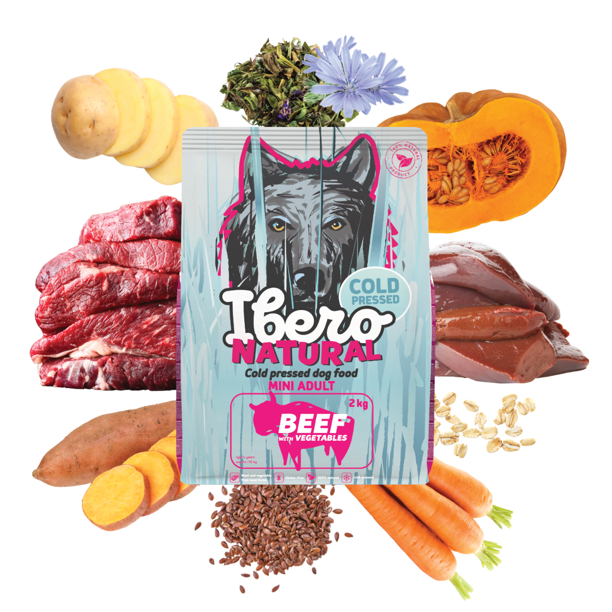 Ibero Cold Pressed Adult Mini Beef je vyvážená a funkčná receptúra navrhnutá tak, aby plne pokryla nutričné potreby dospelých psov malých plemien. Základ tvorí 34% dehydrovaného hovädzieho mäsa , ktoré poskytuje vysoko kvalitné a dobre stráviteľné bielkoviny nevyhnutné na udržanie svalovej hmoty, vitality a celkovej kondície. Jahňacia pečeň obohacuje krmivo o prírodné vitamíny a minerály podporujúce metabolizmus, imunitný systém a chuťovú atraktivitu. Batáty, zemiaky, ovsené vločky, tekvica a mrkva slúžia ako prirodzené zdroje energie, vlákniny a antioxidantov. Ľanové semienko, čakankový extrakt a sušené bylinky harmonizujú trávenie a podporujú zdravie čriev. Beta-glukány posilňujú prirodzenú obranyschopnosť organizmu. Vďaka technológii lisovania za studena si krmivo uchováva svoju prirodzenú chuť a vysokú nutričnú hodnotu. Granule sú hutné, dobre stráviteľné av žalúdku nenaberajú na objeme, čo je ideálne pre každodenné kŕmenie menších psov. Ibero Cold Pressed Adult Mini Beef je 100% prírodné krmivo bez umelých konzervantov, farbív a GMO a predstavuje spoľahlivú voľbu pre dlhodobú, kvalitnú a vyváženú výživu dospelých psov malých plemien.