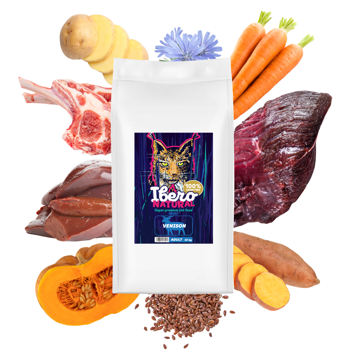 Ibero Grain-free Cat Adult Venison je vysoko kvalitné, chutné a nutrične vyvážené krmivo určené pre dospelé mačky. Základom receptúry je 34% dehydrovaného jelenia , ktoré patrí medzi najcennejšie a najlepšie tolerované zdroje živočíšnych bielkovín. Zverina je prirodzene hypoalergénna, bohatá na kvalitné proteíny a má vysokú biologickú hodnotu, čo z nej robí ideálnu voľbu pre mačky s citlivým zažívaním alebo intoleranciami na bežnejšie druhy mäsa. Receptúra je doplnená o dehydrované jahňacie mäso a jahňaciu pečeň, ktoré zvyšujú nutričnú hodnotu krmiva, podporujú vitalitu a zaisťujú vysokú chutnosť. Sladké zemiaky, zemiaky, tekvica a mrkva dodávajú vlákninu, vitamíny a minerálne látky, ktoré podporujú zdravé trávenie a celkovú kondíciu. Ľanové semienko, čakankový extrakt a beta-glukány prispievajú k správnej funkcii tráviaceho traktu, posilňujú imunitu a podporujú prirodzenú obranyschopnosť organizmu . Taurín je obsiahnutý v optimálnom množstve na podporu zdravého srdca, zraku a nervového systému. Krmivo je 100% prírodné, bez umelých konzervantov, farbív a GMO , vhodné na dlhodobé podávanie ako kompletná a funkčná výživa.