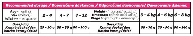 Podávajte suché. Pri prechode na nové krmivo postupujte pozvoľna. Dennú dávku upravte podľa veku, hmotnosti, aktivity a fyziologického stavu mačky podľa kŕmnej tabuľky na obale. Vždy zaistite dostatok čerstvej a čistej pitnej vody. Skladujte na suchom, chladnom a tmavom mieste, obal po otvorení starostlivo uzatvárajte. Dátum minimálnej trvanlivosti a šarže: viď obal.