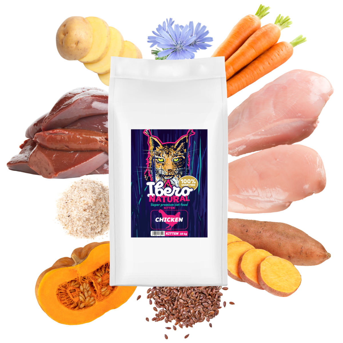 Ibero Grain-free Cat Kitten Chicken je vysoko kvalitné a nutrične bohaté krmivo určené pre mačiatka v období intenzívneho rastu a pre gravidné či dojčiace mačky. Základom receptúry je 40% dehydrovaného kuracieho mäsa , ktoré poskytuje vysoko stráviteľné živočíšne bielkoviny nevyhnutné pre výstavbu svalovej hmoty, správny vývoj kostí a celkovú vitalitu. Vyšší obsah kuracieho tuku zaisťuje dostatok energie pre rýchly rast mačiatok a pokrýva zvýšené energetické nároky matiek. Sladké zemiaky, zemiaky, tekvica a mrkva dodávajú vlákninu, vitamíny a minerálne látky pre zdravé trávenie a správnu funkciu organizmu. Ľanové semienko, psyllium a čakankový extrakt podporujú rovnováhu črevnej mikroflóry a prispievajú k dobrej znášanlivosti krmiva. Beta-glukány posilňujú imunitný systém a pomáhajú budovať prirodzenú obranyschopnosť už od raného veku. Taurín je obsiahnutý v optimálnom množstve pre zdravý vývoj zraku, srdca a nervovej sústavy. Krmivo je 100% prírodné, bez obilnín, GMO, umelých farbív a konzervantov, vhodné na dlhodobé podávanie ako kompletná výživa.