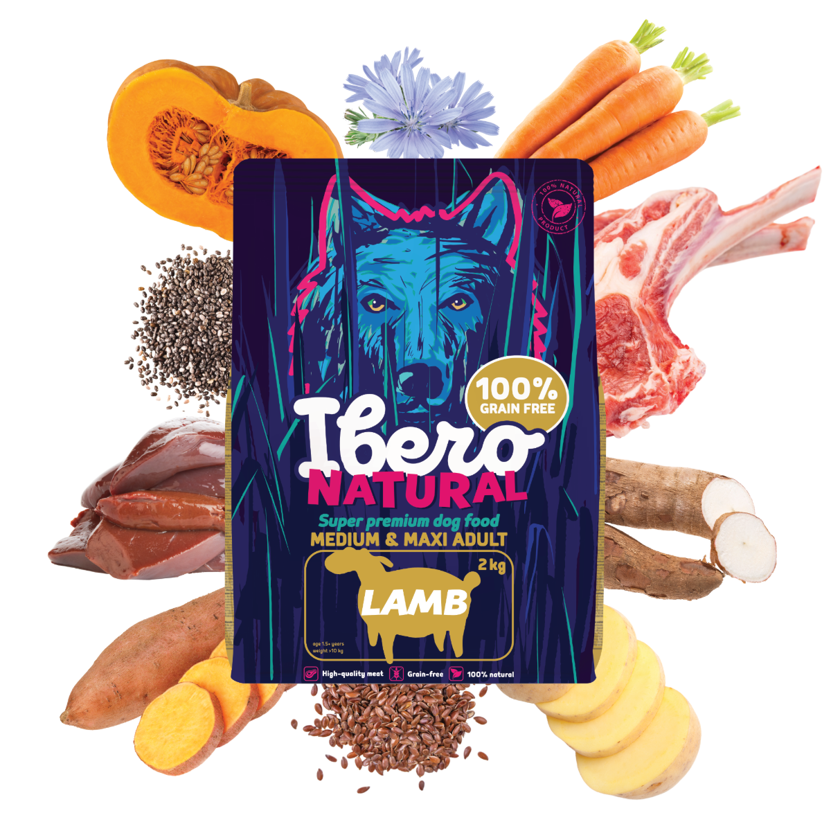 Ibero Grain-free Dog Medium & Maxi Adult Lamb je vyvážené, chutné a ľahko stráviteľné krmivo určené pre dospelé psy stredných a veľkých plemien. Základ receptúry tvorí 31% sušeného jahňacieho mäsa , jedného z najšetrnejších a najlepšie tolerovaných zdrojov proteínu. Jahňacie poskytuje vysokú biologickú hodnotu, výborne chutí a je vhodné aj pre psov s citlivým žalúdkom alebo alergiami. Krmivo je doplnené o batáty, zemiaky, tekvicu a mrkvu , ktoré prinášajú kvalitné sacharidy, prírodnú vlákninu a dôležité vitamíny. Chia semienko, ľanové semienko a čakankový extrakt podporujú zdravé trávenie, črevný mikróbiom, imunitu a lesklú srsť. Kĺbová výživa v podobe glukosamínu a chondroitínu napomáha ochrane a regenerácii kĺbov, čo je pre stredné a veľké plemená obzvlášť dôležité. Receptúra je 100% prírodná, bez obilnín, GMO, umelých konzervantov či farbív. Vhodné na dlhodobé podávanie ako hlavný zdroj kvalitnej a funkčnej výživy.