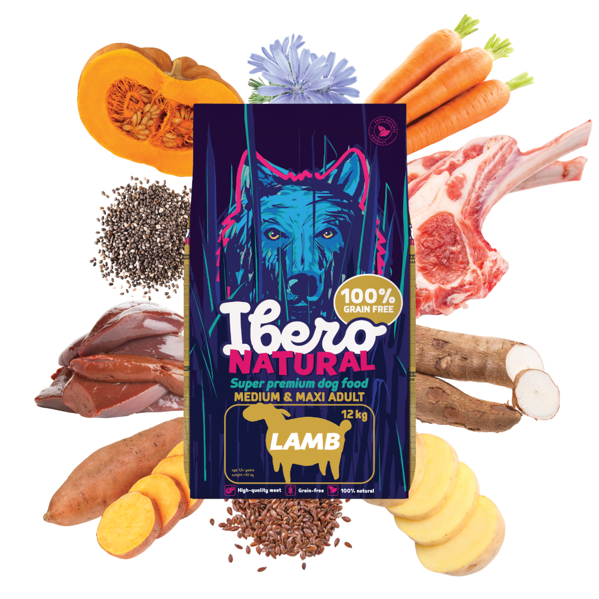 Ibero Grain-free Dog Medium & Maxi Adult Lamb je vyvážené, chutné a ľahko stráviteľné krmivo určené pre dospelé psy stredných a veľkých plemien. Základ receptúry tvorí 31% sušeného jahňacieho mäsa , jedného z najšetrnejších a najlepšie tolerovaných zdrojov proteínu. Jahňacie poskytuje vysokú biologickú hodnotu, výborne chutí a je vhodné aj pre psov s citlivým žalúdkom alebo alergiami. Krmivo je doplnené o batáty, zemiaky, tekvicu a mrkvu , ktoré prinášajú kvalitné sacharidy, prírodnú vlákninu a dôležité vitamíny. Chia semienko, ľanové semienko a čakankový extrakt podporujú zdravé trávenie, črevný mikróbiom, imunitu a lesklú srsť. Kĺbová výživa v podobe glukosamínu a chondroitínu napomáha ochrane a regenerácii kĺbov, čo je pre stredné a veľké plemená obzvlášť dôležité. Receptúra je 100% prírodná, bez obilnín, GMO, umelých konzervantov či farbív. Vhodné na dlhodobé podávanie ako hlavný zdroj kvalitnej a funkčnej výživy.