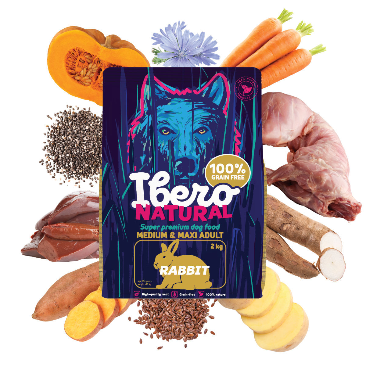 Ibero Grain-free Dog Medium & Maxi Adult Rabbit je ľahko stráviteľná a veľmi chutná receptúra vhodná pre dospelých psov stredných a veľkých plemien. Základom krmiva je 29% dehydrovaného králičieho mäsa , ktoré patrí medzi najjemnejšie a najlepšie tolerované zdroje živočíšneho proteínu. Králičie mäso je prirodzene hypoalergénne, bohaté na kvalitné bielkoviny a výborne stráviteľné, čo z neho robí ideálnu voľbu pre psy s citlivým zažívaním aj pre psy s intoleranciami na kuracie alebo hovädzie. Receptúra je doplnená o batáty, zemiaky, tekvicu a mrkvu , ktoré poskytujú zdravé sacharidy, vlákninu a prírodné vitamíny. Chia semienko, ľanové semienko a čakankový extrakt podporujú zdravé trávenie, črevný mikróbiom a kvalitu srsti. Extrakt z chrupaviek , spolu s glukosamínom a chondroitínom , pomáha chrániť a vyživovať kĺbový aparát, čo je pre stredné a veľké plemená zásadné. Krmivo je 100% prírodné, bez obilnín, GMO, umelých konzervantov a farbív. Vhodné na dlhodobé podávanie ako hlavný zdroj kvalitnej a funkčnej výživy.