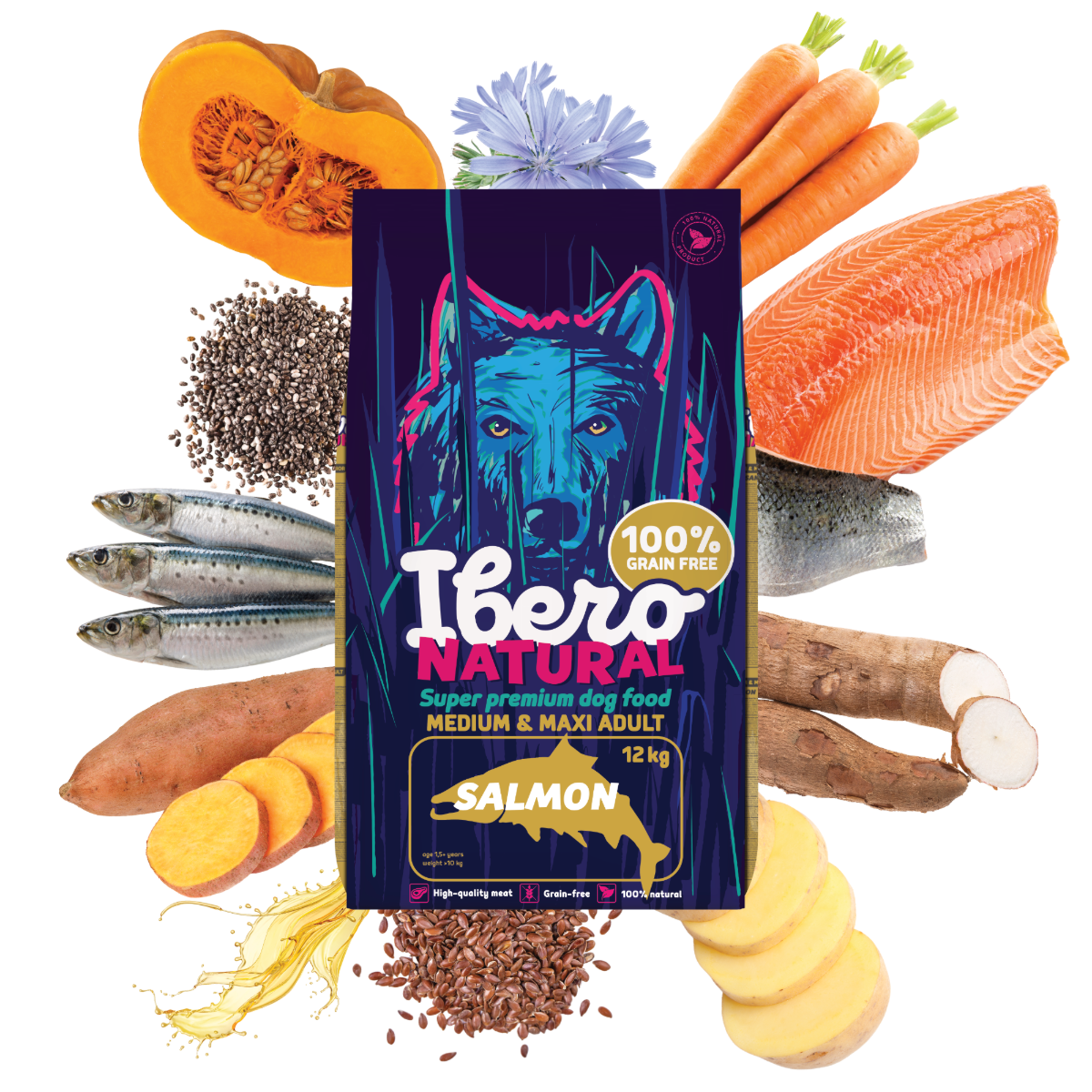 Ibero Grain-free Dog Medium & Maxi Adult Salmon je receptúra vytvorená špeciálne pre psov, ktorí potrebujú kvalitný, ľahko stráviteľný živočíšny proteín s vysokým obsahom omega-3 mastných kyselín. Základom zloženia je 30% sušeného lososa , doplneného o 6% sušených sardiniek a 14% lososového oleja , vďaka čomu krmivo prináša jedinečne vysoký obsah zdraviu prospešných nenasýtených mastných kyselín EPA a DHA. Ryby v tejto receptúre podporujú zdravú kožu, lesklú srsť, imunitu, správnu funkciu srdca i mozgu a zároveň sú skvele stráviteľné - ideálna voľba pre citlivé alebo alergické psy. Komplexná príloha z batátov, zemiakov, tekvice a mrkvy dodáva prirodzené vitamíny, minerály a vlákninu. Chia semienko, ľanové semienko a čakankový extrakt podporujú zdravé trávenie, črevnú mikroflóru a pevnú imunitu. Kĺbová výživa v podobe glukosamínu a chondroitínu pomáha udržať pohybový aparát v skvelej kondícii, čo je kľúčové najmä pre stredné a veľké plemená. Krmivo je 100% prírodné, bez GMO, umelých konzervantov, dochucovadiel a bez obilnín. Je vhodné na dlhodobé podávanie ako kvalitná, funkčná a chuťovo atraktívna strava.