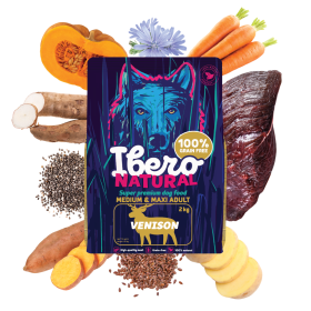 Ibero Grain-free Dog Medium & Maxi Adult Venison je nutrične bohatá a chutná receptúra inšpirovaná prirodzenou stravou vlkov iberských. Základ tvorí 35% sušeného mäsa zo zveriny , čo je mimoriadne kvalitný a ľahko stráviteľný proteín vhodný pre aktívnych, citlivých aj vyberavých psov. Zverina má vysokú biologickú hodnotu, nízky obsah alergénov a prirodzene intenzívnu chuť. Krmivo je doplnené o batáty, zemiaky, tekvicu a mrkvu , ktoré prinášajú prirodzené vitamíny, minerály a vlákninu. Chia semienko, ľanové semienko a extrakt z čakanky podporujú trávenie, črevný mikróbiom, imunitu aj zdravú srsť. Funkčná kĺbová výživa v podobe glukosamínu, chondroitínu a extraktu z chrupaviek napomáha dlhodobej kondícii kĺbov a pohybového aparátu – čo je pre stredné a veľké plemená zásadné. Receptúra je 100% prírodná, bez obilnín, GMO a umelých konzervantov. Vhodná na dlhodobé podávanie ako hlavný zdroj kvalitnej, funkčnej a chutnej výživy.