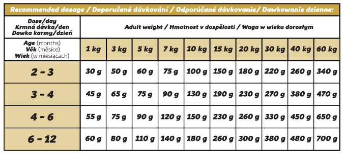 Krmivo sa podáva suché, svojmu psovi zabezpečte prístup k čerstvej vode. Individuálne nutričné potreby závisia od faktorov, ako je vek, plemeno, aktivita a fyziologický stav. Uistite sa, že je vrece po každom podávaní správne uzavreté a skladujte ho na suchom a chladnom mieste mimo priameho slnečného svetla. Dátum minimálnej trvanlivosti/šarže: viď obal.