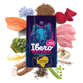 Ibero Natural Active+ je vysoko funkčná superprémiová receptúra navrhnutá pre psov vystavených pravidelnej fyzickej záťaži. Základ tvorí 35% dehydrovaného morčacieho mäsa , doplneného o lososa a krill , ktoré zaisťujú vysoko kvalitné bielkoviny a esenciálne mastné kyseliny nevyhnutné pre výkon, vytrvalosť a regeneráciu svalov. Hydinový tuk a starostlivo zvolené sacharidové zložky dodávajú stabilnú a rýchlo dostupnú energiu, zatiaľ čo prebiotiká MOS a čakankový prášok podporujú zdravé trávenie aj pri vyššej kŕmnej dávke. Prírodné antioxidanty pomáhajú chrániť organizmus pred oxidačným stresom vznikajúcim pri intenzívnej fyzickej aktivite. Ibero Natural Active+ je spoľahlivou voľbou pre majiteľov, ktorí chcú svojmu psovi zaistiť maximálny výkon, vytrvalosť a dlhodobú vitalitu bez kompromisov v kvalite výživy.
