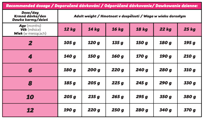 Odporúčame rozdeliť dennú dávku na 2 porcie. Krmivo sa podáva suché, svojmu psovi zabezpečte prístup k čerstvej vode. Individuálne nutričné potreby závisia od faktorov, ako je vek, plemeno, aktivita a fyziologický stav. Uistite sa, že je vrece po každom podávaní správne uzavreté a skladujte ho na suchom a chladnom mieste mimo priameho slnečného svetla.
