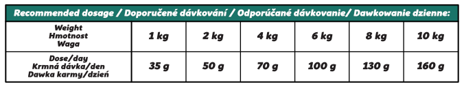 Odporúčame rozdeliť dennú dávku na 2 porcie. Krmivo sa podáva suché, svojmu psovi zabezpečte prístup k čerstvej vode. Individuálne nutričné potreby závisia od faktorov, ako je vek, plemeno, aktivita a fyziologický stav. Uistite sa, že je vrece po každom podávaní správne uzavreté a skladujte ho na suchom a chladnom mieste mimo priameho slnečného svetla.