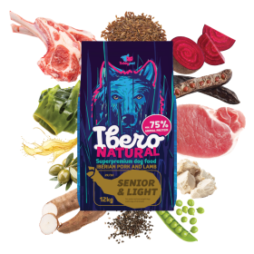 Ibero Natural Senior & Light je vyvážená a funkčná superprémiová receptúra určená na každodennú výživu starších psov a psov s nadváhou. Základ krmiva tvorí 36% dehydrovaného mäsa z iberského polodivokého prasaťa a jahňacieho , ktoré dodáva vysoko kvalitné a dobre stráviteľné živočíšne bielkoviny dôležité pre udržanie svalovej hmoty a vitality aj vo vyššom veku. Znížený obsah tuku a zvýšený podiel vlákniny pomáhajú regulovať telesnú hmotnosť bez negatívneho vplyvu na chuť do jedla. Rybí tuk, morské riasy a chia semienka podporujú zdravie kĺbov, srdca, kože a srsti. Prebiotiká MOS a FOS, inulín, β-glukány a kvasnice harmonizujú trávenie a posilňujú imunitný systém. Receptúra je obohatená o glukosamín a chondroitín sulfát pre dlhodobú ochranu kĺbov a pohybového aparátu, ktorý je u starších a ťažších psov vystavený vyššej záťaži. Prírodné antioxidanty – tokoferoly – pomáhajú chrániť bunky pred oxidačným stresom. Ibero Natural Senior & Light je 100% prírodné superprémiové krmivo, ktoré podporuje zdravé starnutie, optimálnu hmotnosť a dobrú kvalitu života psa .